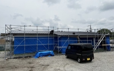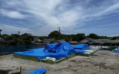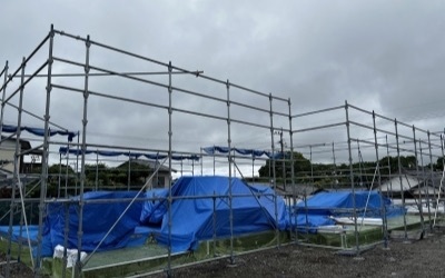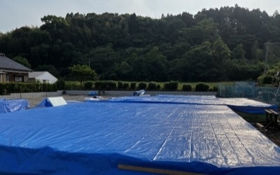 透明シートとブルーシートの二重養生で雨が降っても安心です!