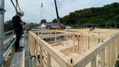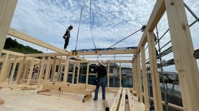 工程が始まるとクレーンオペレーターと大工さんの連携で、番付を終えた柱や梁が決められた位置に正確に配置されていきます。