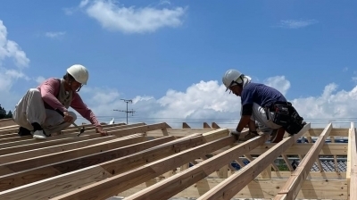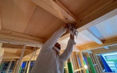 垂木の上で大工さんが丁寧かつ正確に仕事をすすめます。