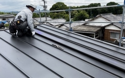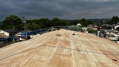 屋根工事の終盤は合板を1枚1枚丁寧に貼り、その上にルーフィングをとめていきます。