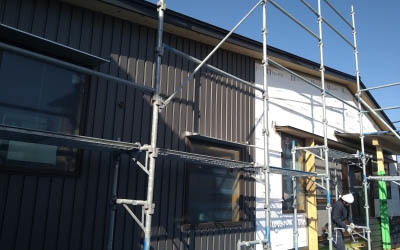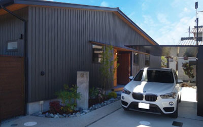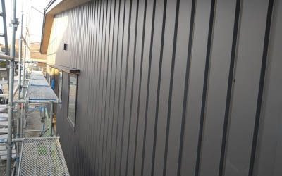 仕上げ材はガルバリウム鋼板。 形状は角波で色はシルバーブラックです。