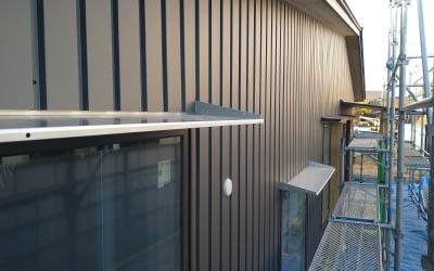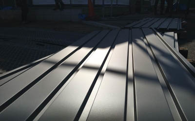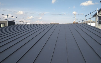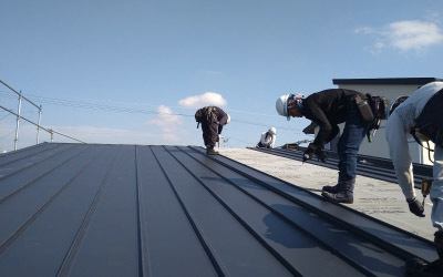 軒先か棟まで延びる継ぎ目のないガルバリウム鋼板の材を一枚一枚精確に貼り合わせていきます。