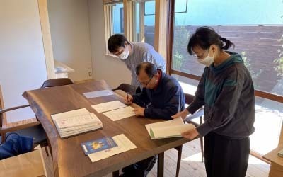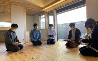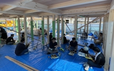 建物を厚手のシートで丁寧に包み、室内で上棟式を行いました。