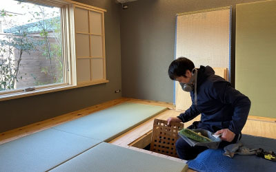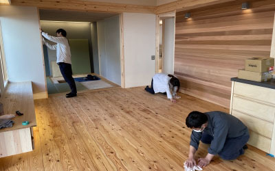 建築中には建築材料の切りくずなどが出るため、目に見えないゴミが残っています。 こまめに掃除機をかけ、丁寧にしっかり磨いていきます。