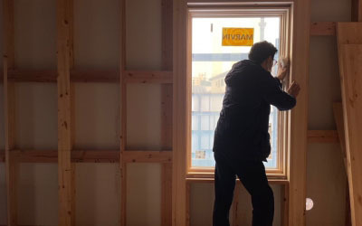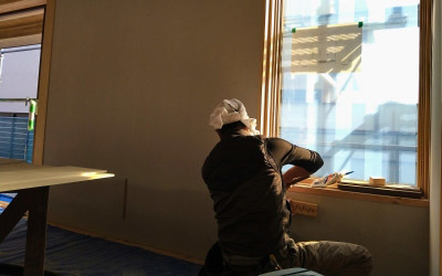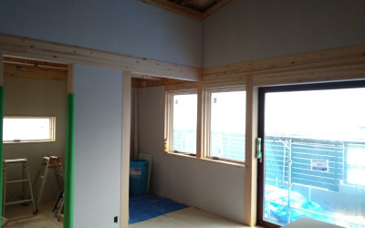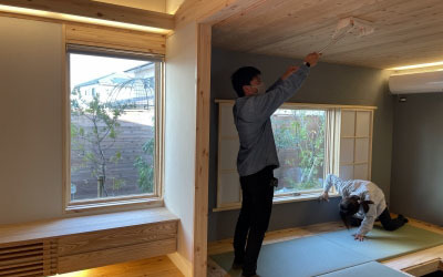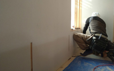 この工事はすべてが現場施工となります。 サッシ廻りなどの開口部に合わせ材料をカットし微調整して納めます。