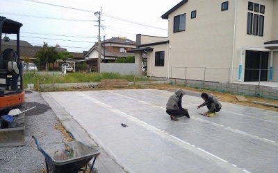 床掘りが完了したら、砕石を敷き均し転圧します。