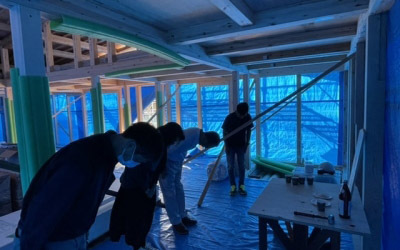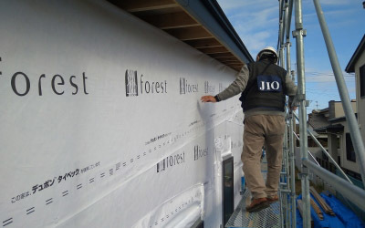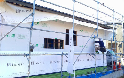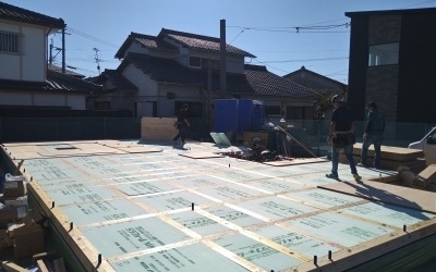 外廻りの耐力面材施工の様子。 施工後、その上から1枚目の透湿防水シートを貼ります。