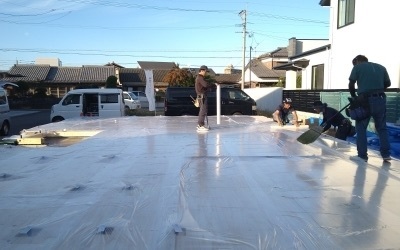 その後、 透明の保護フィルムでしっかりと雨養生を行います。