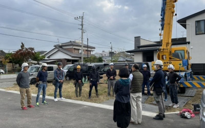 これからの工事安全を願い、二礼二拍手一礼。 建築に参加する意味をこめ、ピンを打ち込みます!