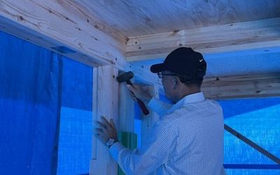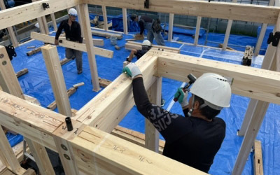 建て方当日までは外部作業が続くため、木材が雨にさらされないように細心の注意を払います。