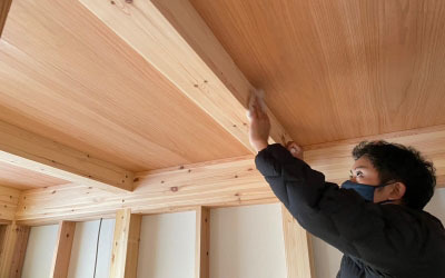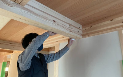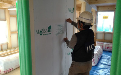 さらにフォレストの家は柱、梁を見せる真壁造りのため、その内側に隙間なく綺麗にモイスを納めていかなくてはなりません。 施工的に難易度が高く、1枚あたりの施工にかなりの時間を要します。