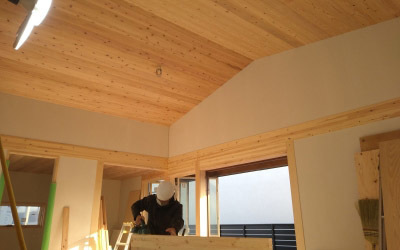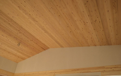 そしてこちらはリビングに施工された勾配天井です。 切妻屋根の棟ラインに頂点を合わせきれいに納められています。