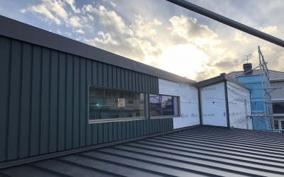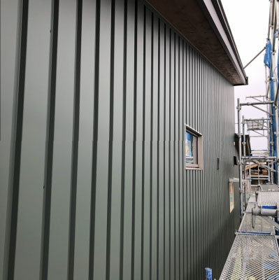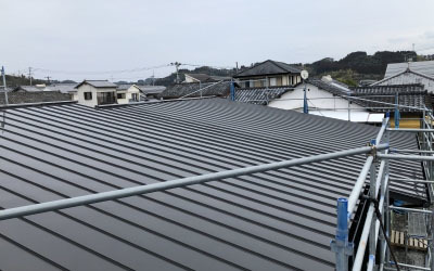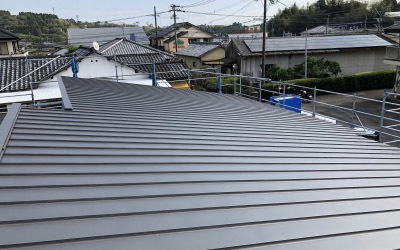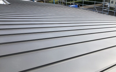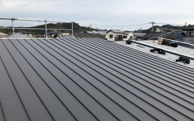 規則正しく一直線に流れる立平葺き屋根の完成です。