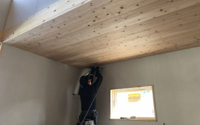 電気配線や下地がむき出しだったキッチンの天井も杉板で綺麗に仕上げていきます。