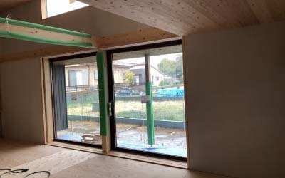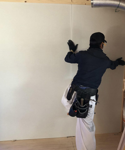 一方、内部では大工さんが慎重に1枚1枚モイスを張り進めます。 Forestでは石膏ボードにビニールクロスを貼るのではなく 室内壁のほとんどがモイスの一発仕上げ。