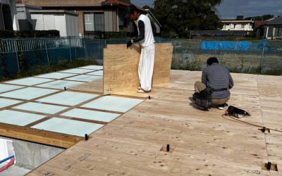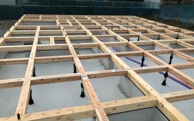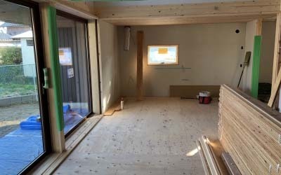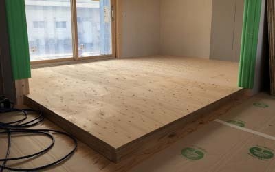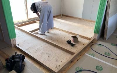 リビングにつながる和室の床上げ作業中。 和室に敢えて段差設けることで特別感や高級感が生まれ、単調になりがちな空間にも変化を持たす事が出来ます。