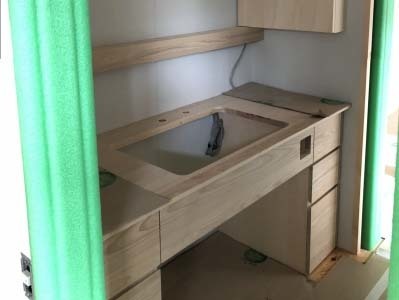 1枚の板からここまで造り上げる技術はまさに職人技の一言。 水栓にタイル、鏡や照明が取り付けられ完成です。