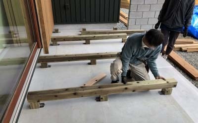 テラスではウッドデッキの土台を組み上げていきます。 勾配や割付を考えながら丁寧に。