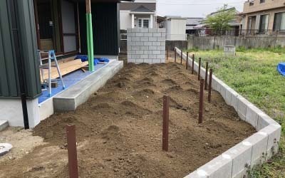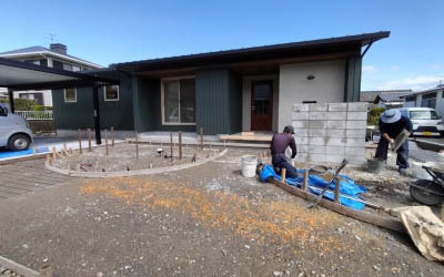玄関前のアプローチやブロック造の壁、カーポートや植栽枠のベース造りをすすめていきます。