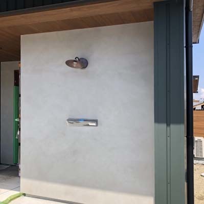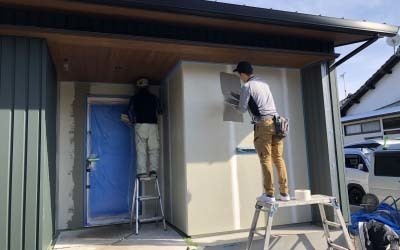 建物の顔となる玄関の仕上げ塗りも実施。 職人さんのコテ捌きが神技過ぎていつも見入ってしまいますね…