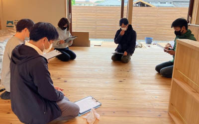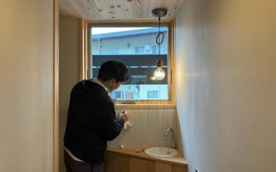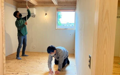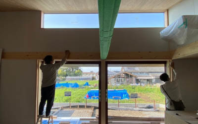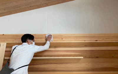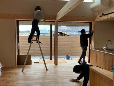 構造躯体を中心にサッシや壁なども丁寧にみがいていきます。 番付という厳しい審査を通り抜けてきた木材がさらに引き立てられるようにお引渡しまで磨きはつづいていきます。