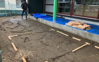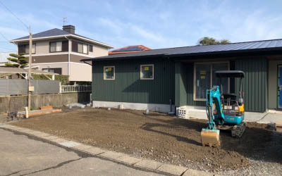 まずは外部全体をユンボで均一に敷均し各セクションごとに準備にとりかかります。