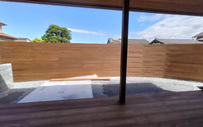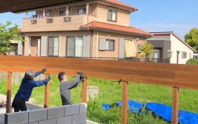 デッキ側ではウッドフェンスの作成中。 穏やかに包み込むように、緩やかなRを描きながらプライベート空間を造り出します。
