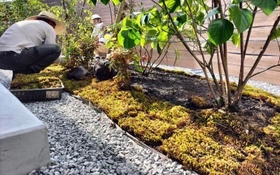 仕上げに下草やコケ、ゴロタ石を敷きつめ完成は目前。