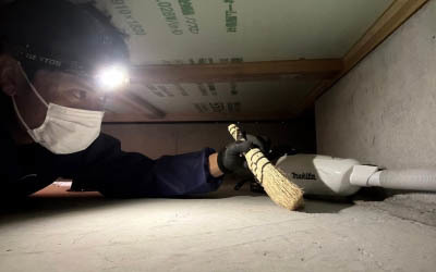 普段の暮らしでは目にすることや肌に触れることの無い床下ですが。。。 現場担当のKさんが数時間をかけ、手箒と掃除機を操りながら最後の最後までしっかりと磨きました。