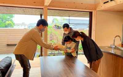 最後に、Kちゃんから職人さんへプレゼント。職人さんたちの頬が思わず緩みます。