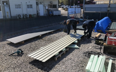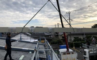 クレーンを使い、屋根鋼板を慎重に屋根の上へ。
