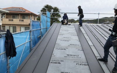また外壁を貼る前には2枚目の透湿シートで綺麗にラッピング。 何十年と快適・安心に住めるように下地部分も複層構造にします。 板金外壁を張る為の下準備が始まりました。