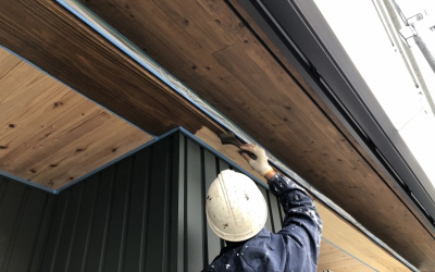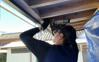 外壁の防水処理後、軒天材には仕上げ塗装を実施。 刷毛で少しずつ丁寧に色を塗り重ねていき…