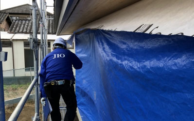 屋根の防水下地をしっかりと施工した後、建物全体を厚手の防水シートで包み、建て方完了です。