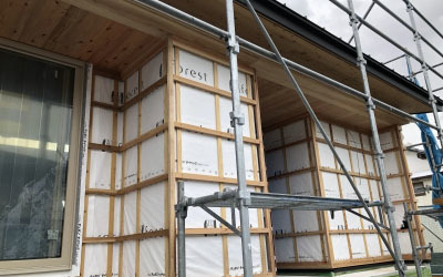 外部では外壁の下地材を縦横の格子状に組み上げます。