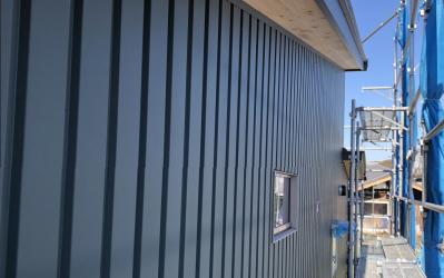 白いシートでラッピング状態だった外壁が段々と色付いてきました。