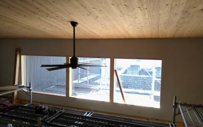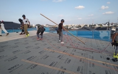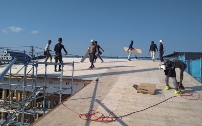 高さを感じさせない大工さんたちの軽やかな動きで順調に進んでいく屋根工事。