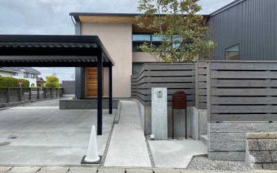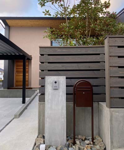 外構計画はアプローチ、カーポート、木塀、ウッドデッキ、塗装色、植栽、照明・・・と 多岐にわたります。