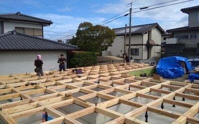 この工程では見慣れた光景ですが、 碁盤目状に規則正しくひろがる木の構造物は見ていてとても気持ちいいです!
