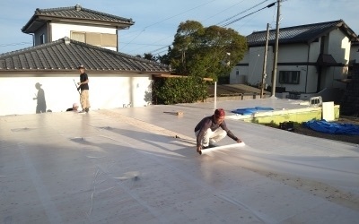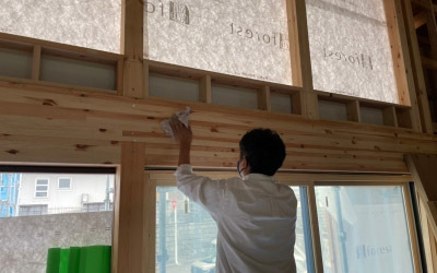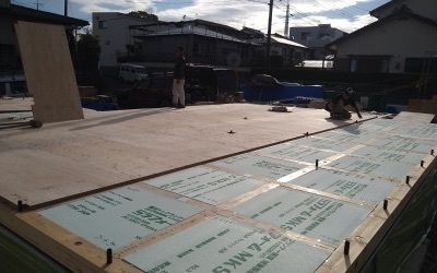 面材施工後は建物外周部を透湿防水シートで覆います。