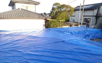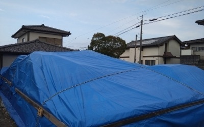 屋根下地材でしっかりと雨仕舞い、建物はブルーシートで全体を丁寧に包みます。