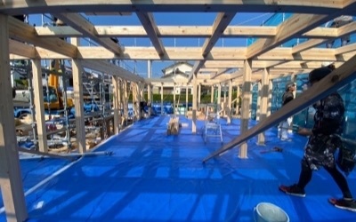 今日はこの舞台の中で、大工さんたちが流れるような軽やかな動きで 屈強な構造を組み上げ、新たな木の家が誕生します。
