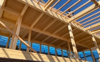 柱と梁が精度の高い金物でしっかりと組まれていきます。