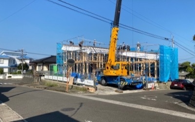 土台に柱を立てたところで、クレーン屋さんがピンポイントで梁を運び 大工さんへバトンタッチ。