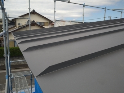立平葺き仕様。 軒先から棟まで継ぎ目のない屋根材が直線的に広がります。