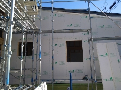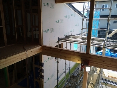 また外部廻りでは屋根工事と並行して耐力面材施工も完了しております。