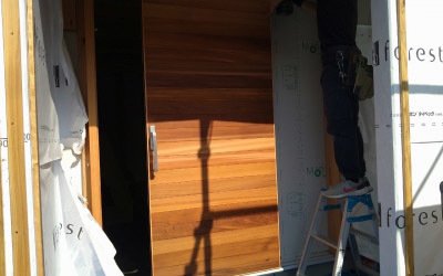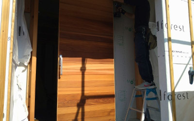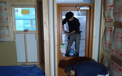 ガッチリと固定養生された木製サッシ。 いちばん大きなサッシで幅2.5m、高さ2.1mもあり軽く100kgを超える重量となります。 細心の注意を払いながら全力搬入です!