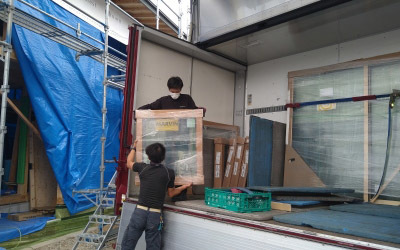 現場に4tウィングの大きな輸送車が到着☀ 約1万㎞ 離れたアメリカの製作工場から3カ月の旅路を経て、窓が到着しました。