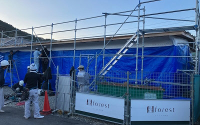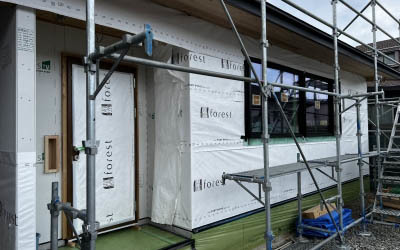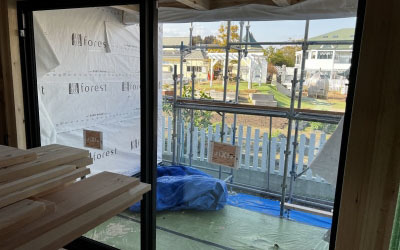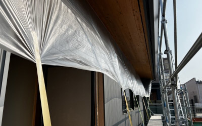 建物全体を厚手のシートでラッピングし建て方工事すべての工程が完了です!!