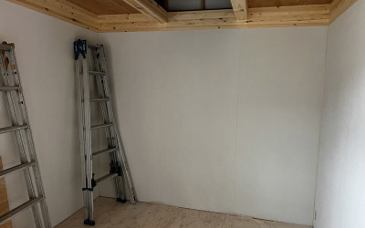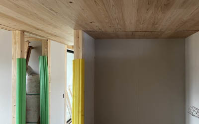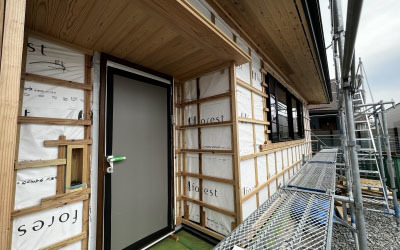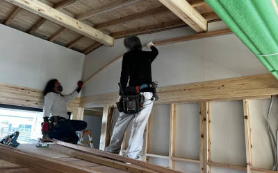 玄関ドアのお披露目が楽しみです。 外壁を張り終え防水コーキング処理を施し、軒天井の塗装へ。
